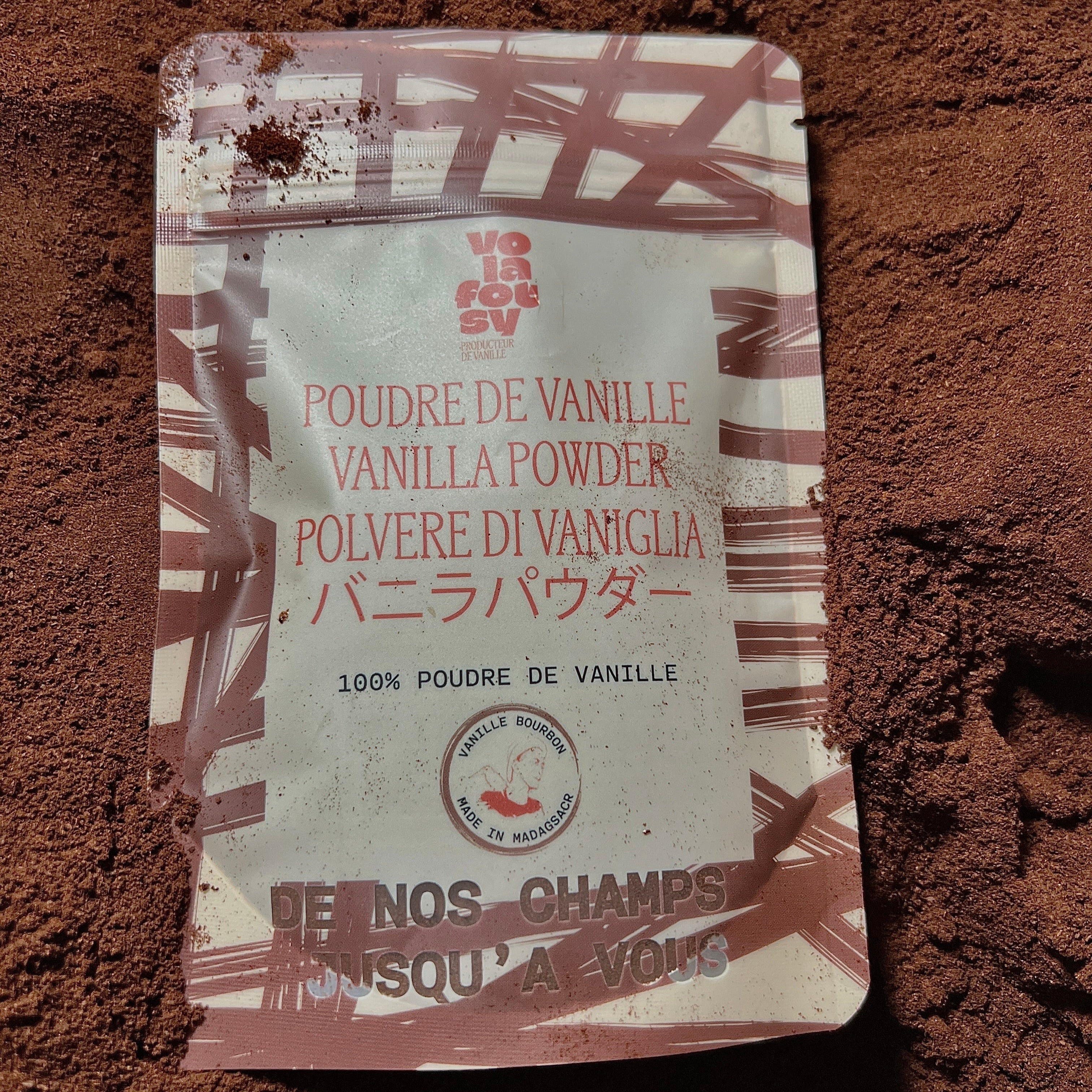 Lapoudre de vanille 100 % Bourbon est obtenue enbroyant finement des gousses entières de vanille Bourbon, sans aucun ajout.